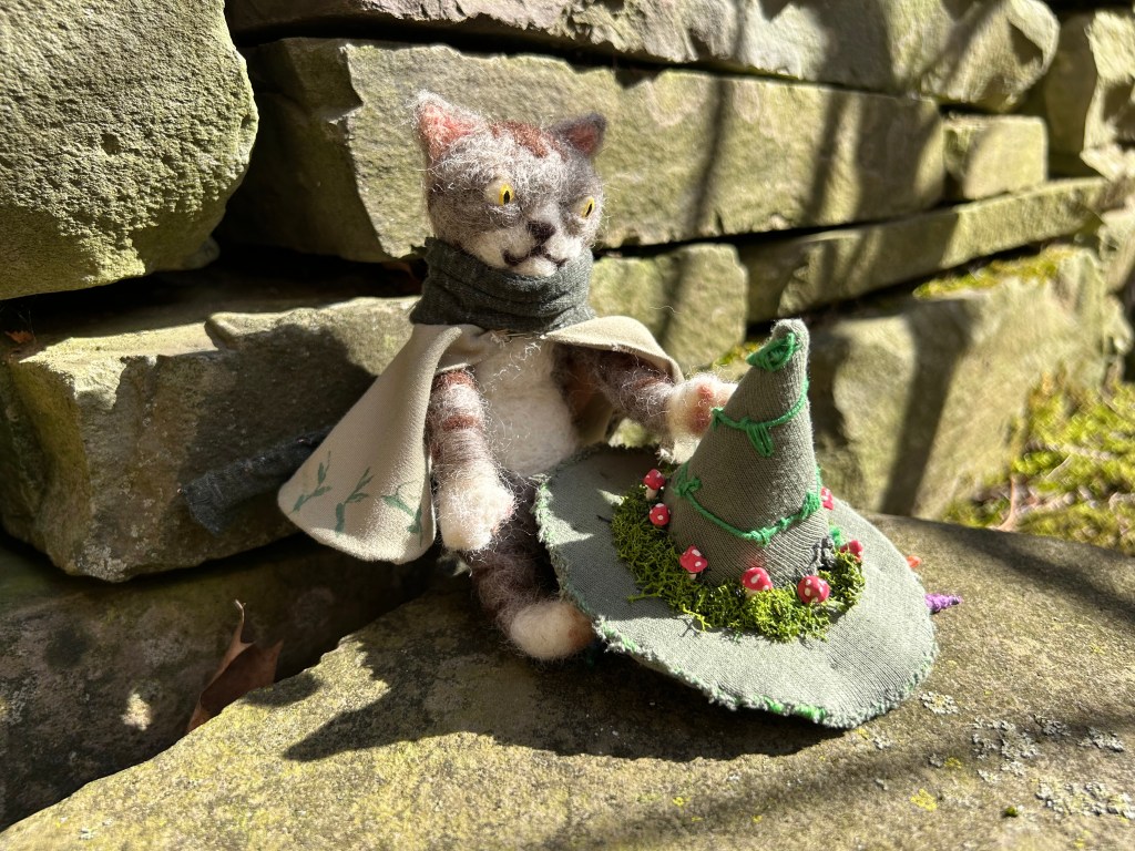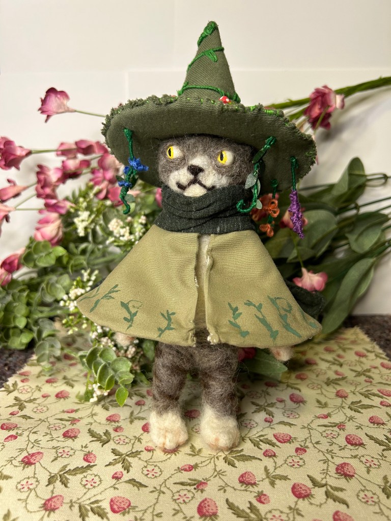 Hazel The Little Witch Cat, 2023, wool, wire, fabric, acrylic paint, embroidery thread, polymer clay, moss, 4″ x 8″ x 3″
