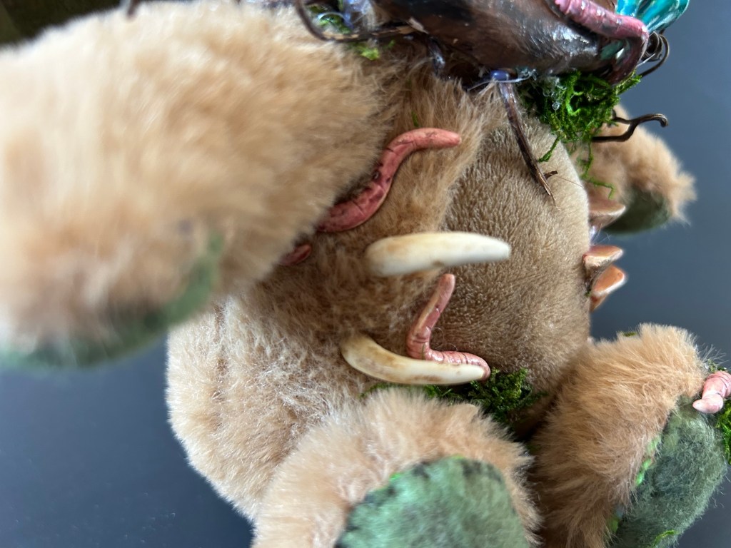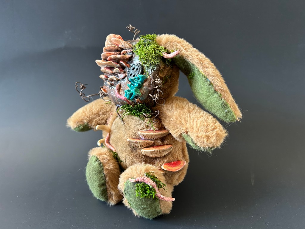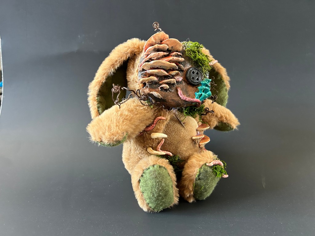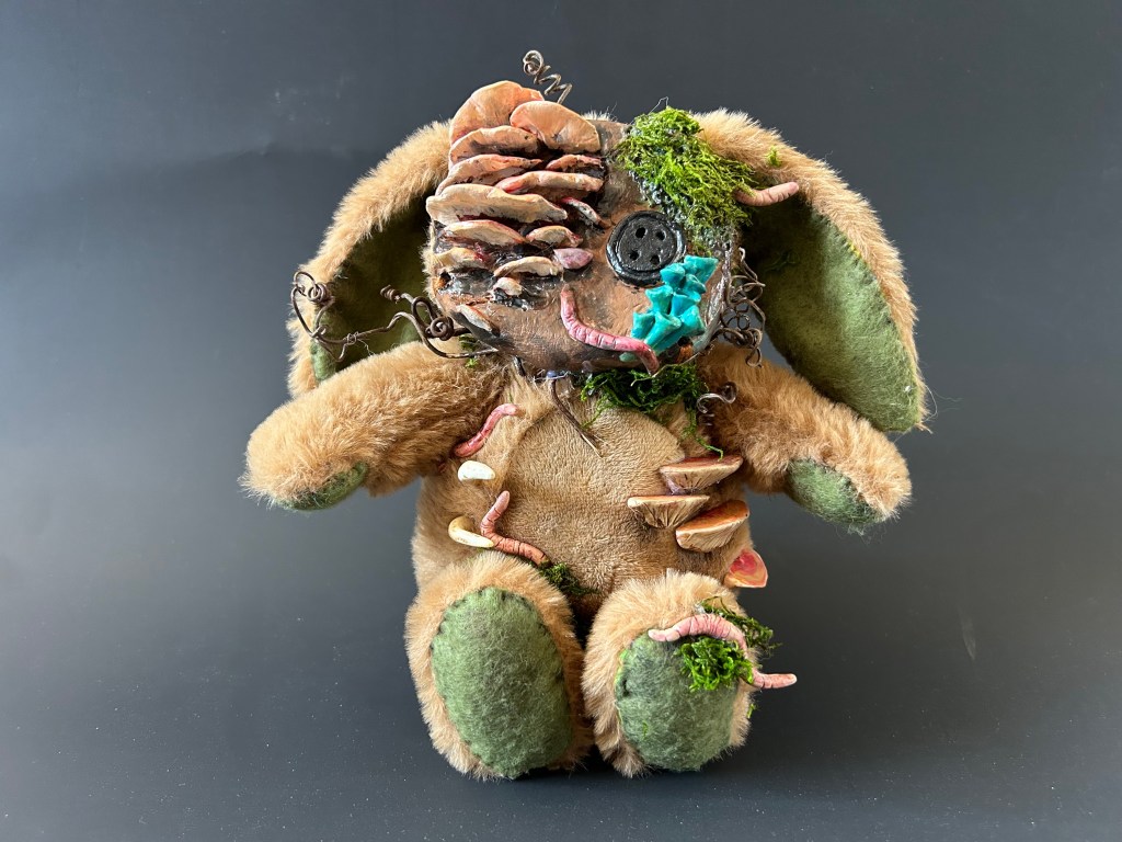 Decaying Friend, 2024, plush rabbit, felt, polymer clay, acrylic paint, found nature elements 8″ x 10″ 4.5″